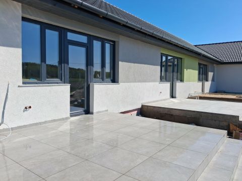 Tető: Antracit Terrán beton cserép, alumínium ereszcsatorna.